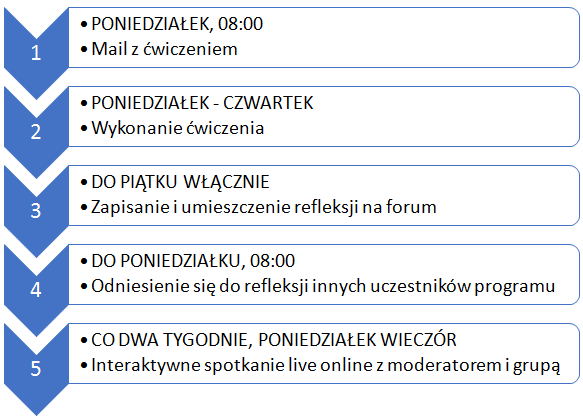 - Co dwa tygodnie będziesz mieć interaktywne spotkanie live online z pozostałymi uczestnikami programu oraz moderatorem. Będzie to okazja do pogłębionej refleksji nad dotychczasowymi doświadczeniami. Spotkanie będzie trwało 60 minut. [SR]