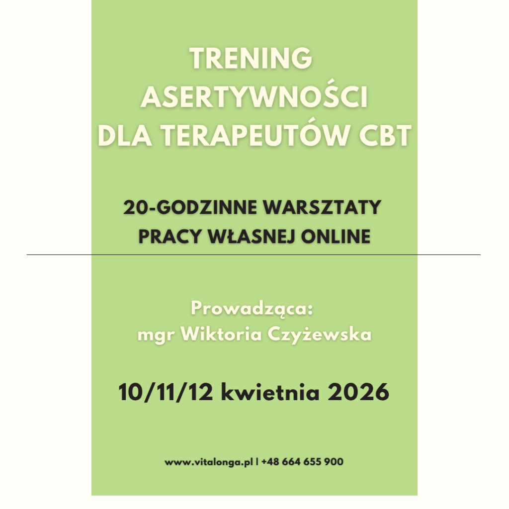Pakiet 3 lub 2 warsztatów online dla psychoterapeutów CBT oraz terapeutów w trakcie certyfikacji: „Self-Practice / Self-Reflection”, „Trening asertywności dla terapeutów CBT”, „Ja jako terapeuta CBT”. INFORMACJE O SZKOLENIU Terminy: Trening Asertywności: 10-12 stycznia 2025 r. Ja jako terapeuta CBT: 1-2 marca 2025 r. Self-Practice/Self-Reflection: od 3 marca 2025 r. Prowadząca: mgr Wiktoria Czyżewska Forma …
