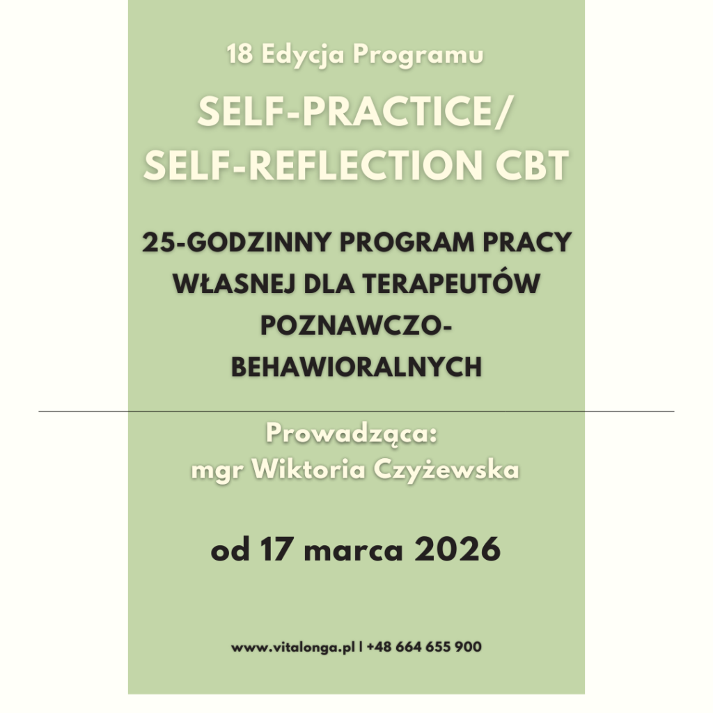 Pakiet 3 lub 2 warsztatów online dla psychoterapeutów CBT oraz terapeutów w trakcie certyfikacji: „Self-Practice / Self-Reflection”, „Trening asertywności dla terapeutów CBT”, „Ja jako terapeuta CBT”. INFORMACJE O SZKOLENIU Terminy: Trening Asertywności: 10-12 stycznia 2025 r. Ja jako terapeuta CBT: 1-2 marca 2025 r. Self-Practice/Self-Reflection: od 3 marca 2025 r. Prowadząca: mgr Wiktoria Czyżewska Forma …